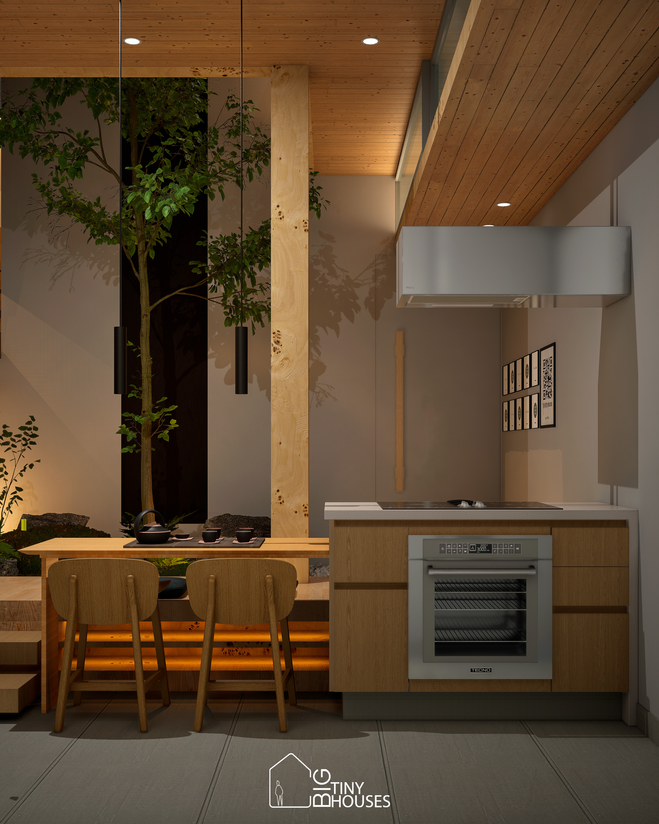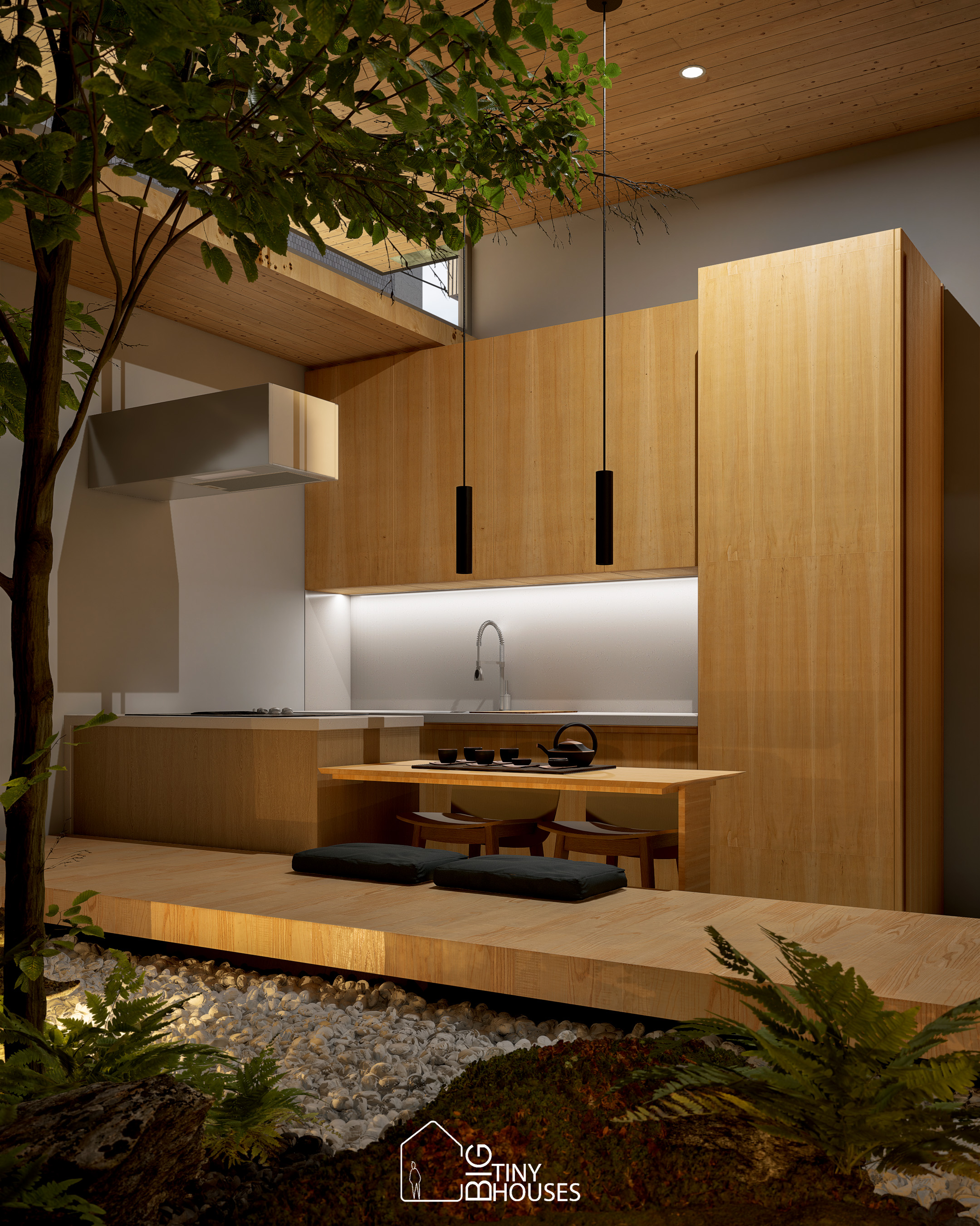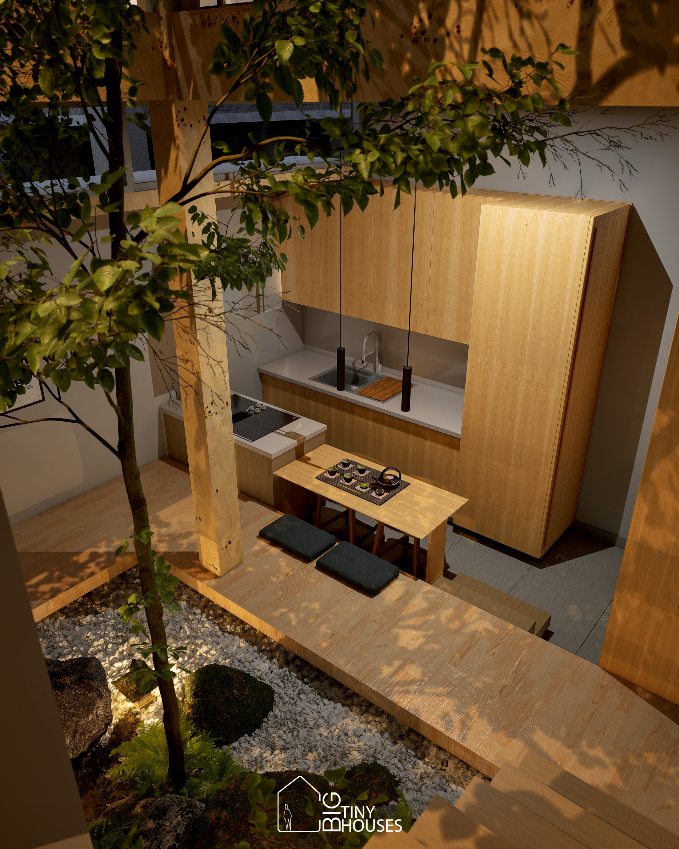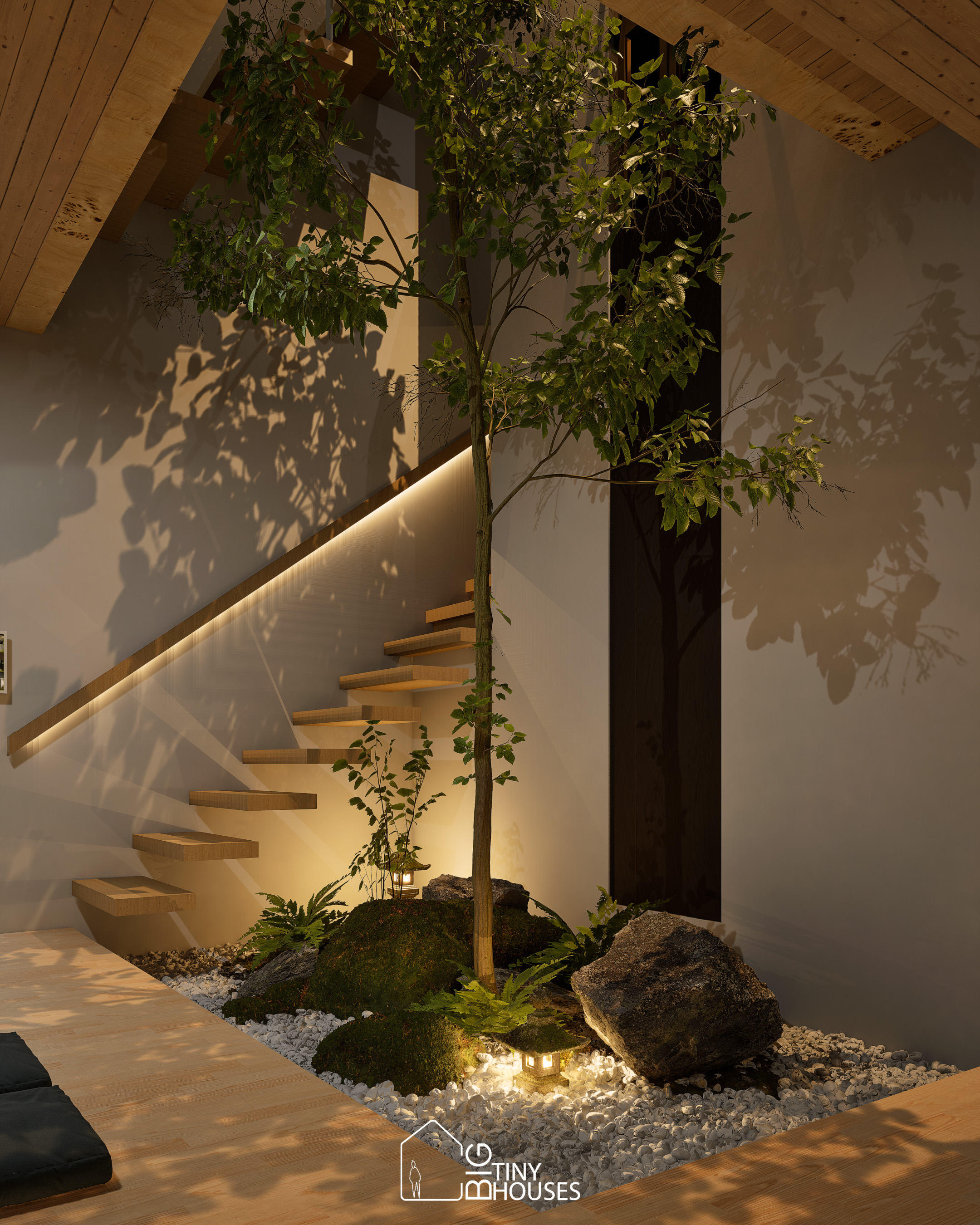 Due to being a small house on a 5mx10m / 16,40ftx32,80ft plot, this garden and contemplative space are small but of immense importance to the house. In addition to helping spread sunlight throughout the house, the roof has automatic windows, transforming this empty space into a conduit for winds, thus cooling the house's interiors.